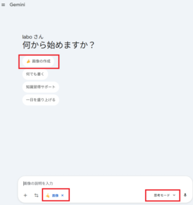 入力欄の下(または横)にある「🍌画像を作成」(または「Create images」)アイコンをタップ(クリック)します。そして、「思考モード」に切り替えます。