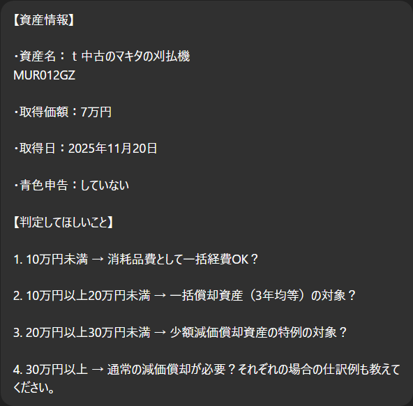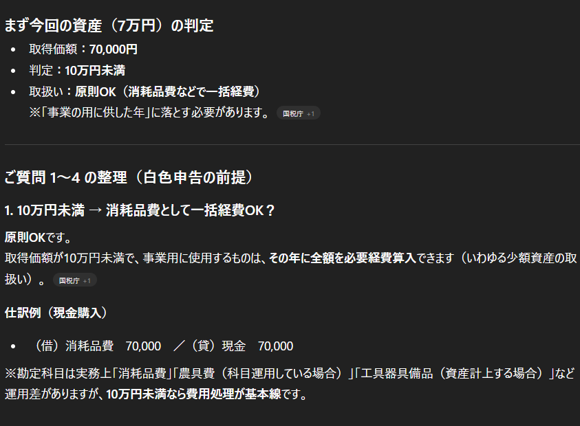 1. 10万円未満 → 消耗品費として一括経費OK?